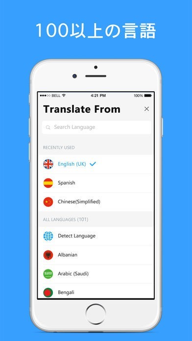これは、あらゆる言語を素早く翻訳できる、多言語翻訳アプリです。Appleの音声認識機能のサポートにより、文字だけでなく音声の翻訳も可能です。音声翻訳は42の言語に対応しています。