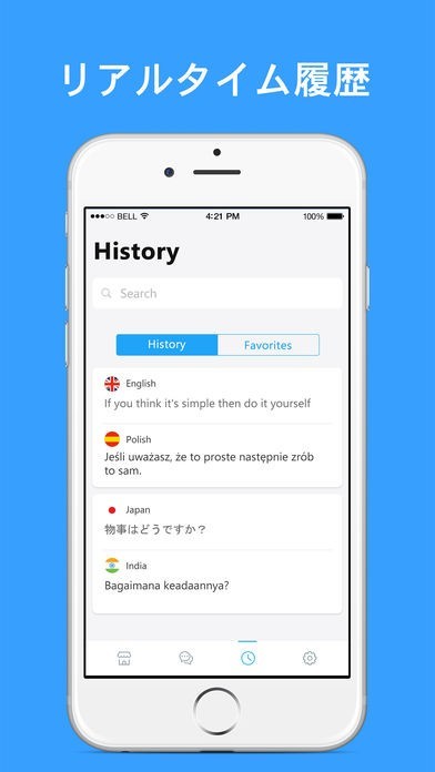共有機能が搭載されているので、テキストや変換した文章を友達に送りたい時に役立つでしょう。さらに履歴機能が付与されているため、翻訳文を再確認したい時にも便利ですね。