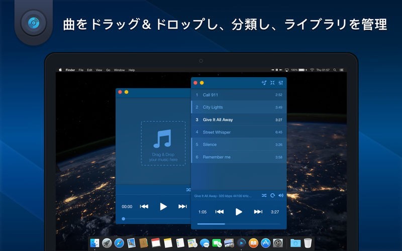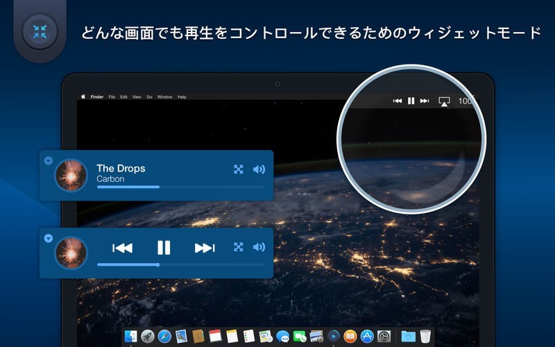 - mp3、 wav、 aiff、他の一般的なフォーマットであなたの好きな音楽をドラッグとドロップしてください(またはプレーヤーのメニューからブラウズする)。