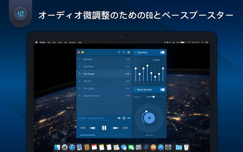 - イコライザーを使用して音声出力を調整してください(二つのモード:3つまたは8つバンド)。