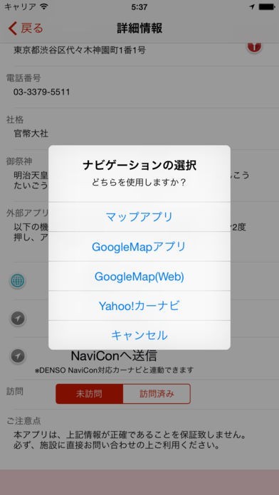 カーナビに連動することが出来る機能を搭載しているので車で神社まで向かいたいという時にこのアプリで見つけた神社をまたカーナビで検索する必要がなく二度手間にならないので便利です。