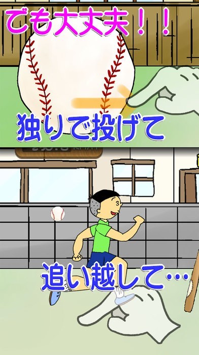 「涙を拭けよ!ぼっち野球」は野球を一緒にしてくれる仲間がいない「なかしま君」になって一人で野球をするゲームです。 まずボールをスワイプして飛ばします。次にバットを目指して連続でタップします。飛んできたボールのタイミングに合わせてタップして打ちます。このときのタイミングでボールの飛距離や高さが決まります。