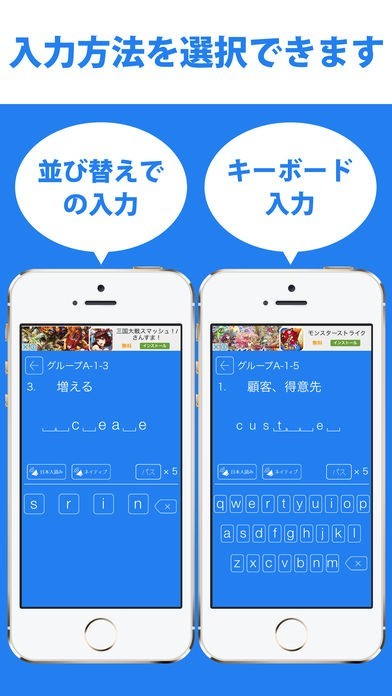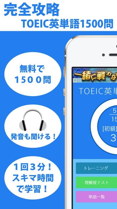 発音を聞きながらタッチでアルファベットを選びスペルを完成させることでTOEICによく登場する英単語1500個を学習していくアプリです。10問ごとに学習していくシステムなので隙間時間にちょっとずつ覚えることができます。学習トレーニングの他、連続正解を目指す確認テストや90秒以内に多くの正解を目指すタイムアタックなど、ゲーム感覚で復習ができるので楽しく英単語を覚えることができます。