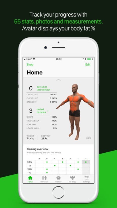 The app is full of features—70+ features, 360+ exercises with 3D-animations, many workouts and 65+ statistics are waiting for you on iPhone, and 25+ features on the watch. You'll find everything in the unlimited Premium version. Download the app for free. Use the Premium version free for 7 days—then stay with us if you like what you experience. You can select to pay monthly or yearly, both start with the free trial. Payment will be charged to iTunes Account at confirmation of purchase. You'll find a feature list in the Settings menu, the price of monthly and yearly fee in your currency in the Shop. Subscription automatically renews unless auto-renew is turned off at least 24-hours before the end of the current period. Account will be charged for renewal within 24-hours prior to the end of the current period, and identify the cost of the renewal. Subscriptions can be managed by the user and auto-renewal can be turned off by going to the user's App Store Account Settings after purchase. No cancellation of the current subscription is allowed during the active subscription period. Any unused portion of a free trial period, if offered, will be forfeited when the user purchases a subscription to that publication.