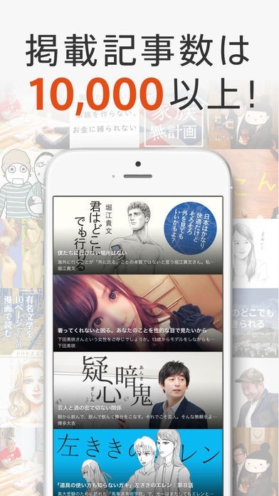 「cakes」は、既刊または刊行前の単行本や雑誌からよりすぐった、コミックや小説、エッセイ、レポートなどの10000以上のコンテンツ作品を連載形式で楽しめるリーダーアプリです。無料で利用する場合は基本的に連載1回分のコンテンツからさらに抜粋した部分が読めるだけなので、あくまで幅広い作品を立ち読みできるサービスとして割り切る必要はありますが、連載1回目のコンテンツなどは掲載分全体を閲覧できる場合も多いです。また月額600円の有料会員として登録している間は、すべての掲載コンテンツが読み放題となります。