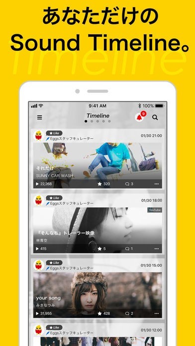 「Eggs」は、インディーズ音楽もたっぷり満喫できる音楽プラットフォームアプリです。 便利なタイムライン機能を搭載しており、お気に入りのアーティスト情報も、友達がオススメする情報も手軽にチェックできるようになっています。 楽曲再生プレイヤーを利用すれば、ランキングやタイムラインから気になる曲をすぐに再生可能。 友達がイチオシする曲を即再生して、会話ネタとして盛り上がることもできるでしょう。 また、フォロー機能では気になるユーザーをフォローして友達に拡散し、応援できるのも特徴です。