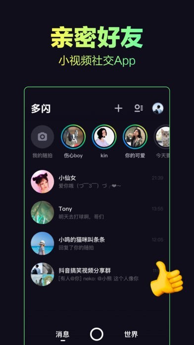 多闪是一款专为亲密好友准备的App,与亲密的好友用小视频互动,让聊天更有趣。