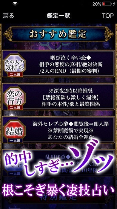 このアプリには、恋愛とお金にフォーカスした占いが充実しています。あの人の気持ちから恋の行方、さらには結婚運にいたるまで、セレブも心酔した占いをスマホで手軽に体験することができます。