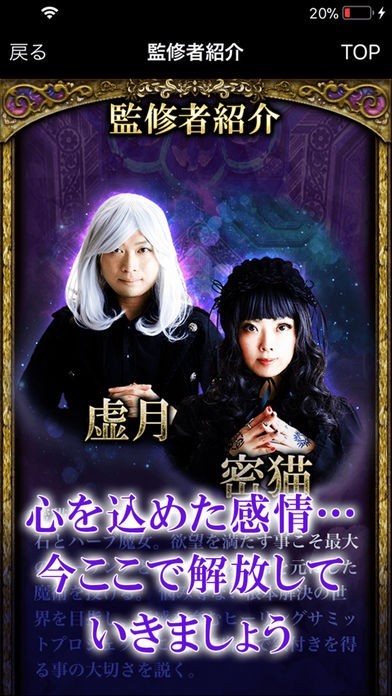 このアプリは二人の占い師「蜜猫・虚月」先生の監修による占いアプリです。テレビや雑誌で紹介され、今最も的中率の高い占い師と言われているほど。本場イギリスで習得した黒魔術で、あなたのお悩みを全て解決します。
