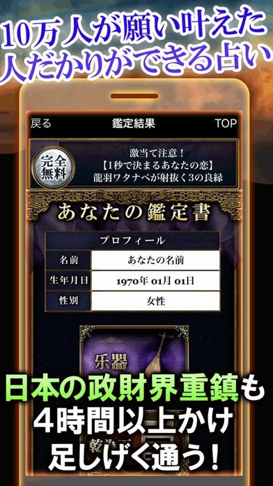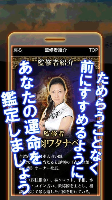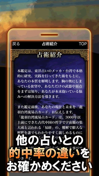 これは、台湾でナンバー1の占い師、龍羽ワタナベ先生監修による占いアプリです。他の占いアプリとは一線を画した的中率により、ユーザーの皆様から圧倒的な支持をいただいてきました。