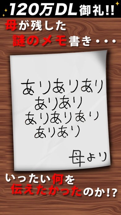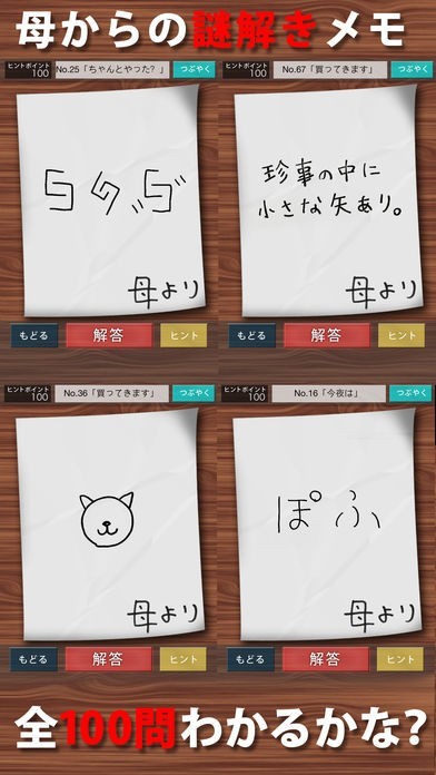 謎解き母からのメモは、出題されるクイズにじっくりと集中しながら、いつでも自由にチャレンジ出来ます。謎々が好きな方に最適である、充実した内容の魅力的なゲームアプリです。ヒントまで設けられている為、解答出来ずに困ったとしても、そのツールを上手く活用すれば良いので安心です。母親が書き残した覚え書きは全部で100問です。様々な問題が豊富に用意されている為、クイズへと見事正解する事で大きな達成感を必ず得られます。1度見ると単なる落書きのような印象があります。僅か数秒で答えらる優しい問題や、1分間真剣に考えても全く解答出来ない問題がいっぱい揃えられています。