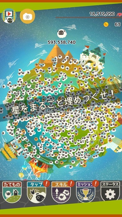 タップすることで羊の数をひたすら増やしていくゲームです。増やした羊を使うことで「たてもの」を建てることができ、羊の生産量が上がります。タップ自体のレベルを上げることもでき、1回あたりの羊の生産数が増えたり自動で羊を生産できるようになります。 惑星が羊で埋め尽くされるほど数が増えたら、別の惑星に引っ越しすることができるのでずっとプレイできます。 羊の数を増やすことを目的にするだけでなく、かわいい羊の姿を見て癒しを得ることもできます。