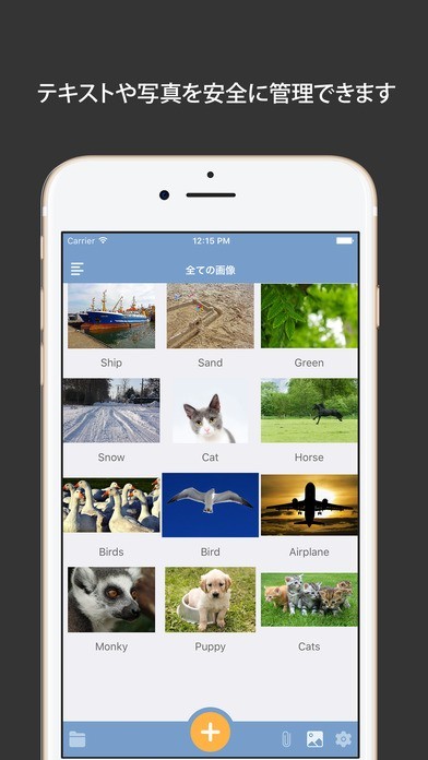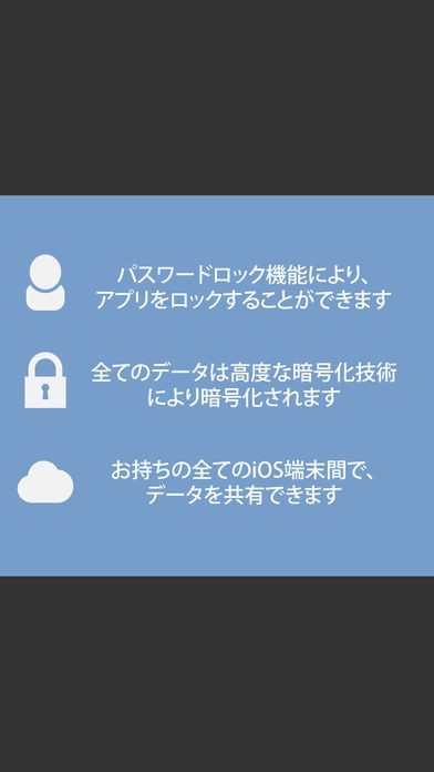 保存しているテキストや画像をすべて暗号化して管理するので、パスワードの管理も安心して行えます。また、合わせてアプリ利用にパスワードロック設定しておけばよりセキュリティが強化されます。