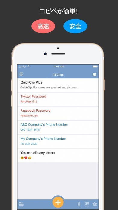 パスワードや指紋認証によるアプリのロックをすることができます。また、クリップの内容は暗号化されて保存されるため、個人情報やパスワードなどの保存にも適しています。