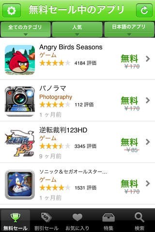 App Storeより引用「セール中のアプリ一覧」は無料になったアプリや、割引セール中のアプリを一覧で見ることができるアプリです。