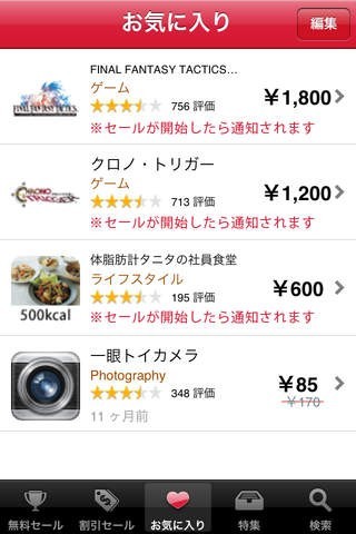 気になるアプリをお気に入りに登録しておくと、セールが始まったら自動的に通知されます。