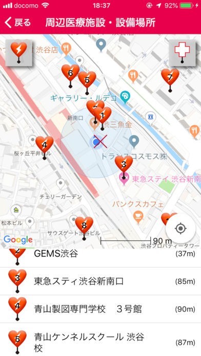 倒れている人を発見した際に必要な一次救命処置の流れや、近隣のAED情報の検索、表示が出来ます。また、子どもの急病への対処に迷った時の救急受診のガイドを提供します。