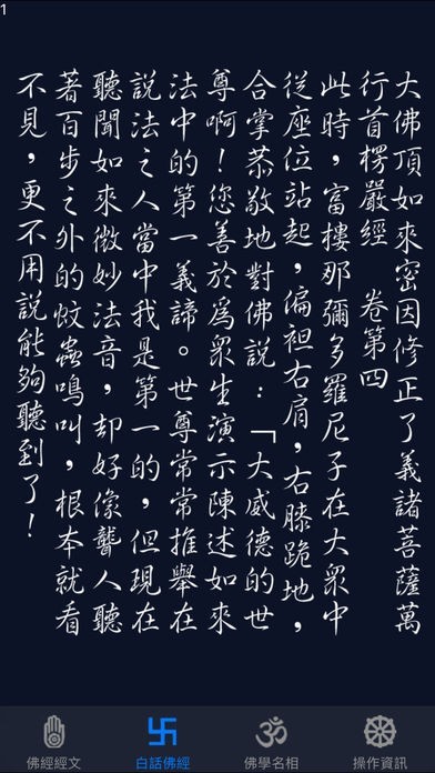 楞嚴經全經共有十卷,因卷帙疊繁浩,再加上白話譯文與佛學名相解釋,頁數更為可觀,故將此十卷,分別製作了十個App, 以『楞嚴經卷一』、『楞嚴經卷二』…『楞嚴經卷十』的方式命名,請以此關鍵字在App Store搜尋即可。