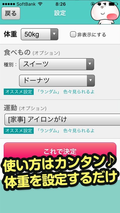 いろんな食べ物のカロリー計算をした上で、それを消費するためにどんな運動をどれくらいするべきかを、「あぶらみくん」が教えてくれるアプリです。設定は体重を入力するだけで、あとは計算してほしい食べ物と運動を具体的に選択するだけです。またはランダム設定にして、計算内容は「あぶらみくん」にお任せすると、彼をタップする度にいろんなコメントを発してくれます。カロリーを意識した食事や間食をすることで、結果の出るダイエットができるようサポートしてくれます。