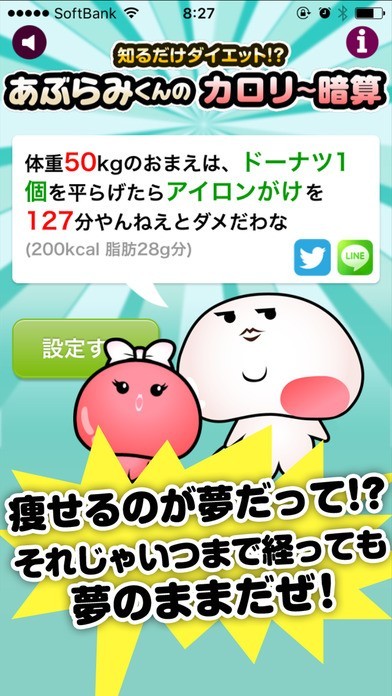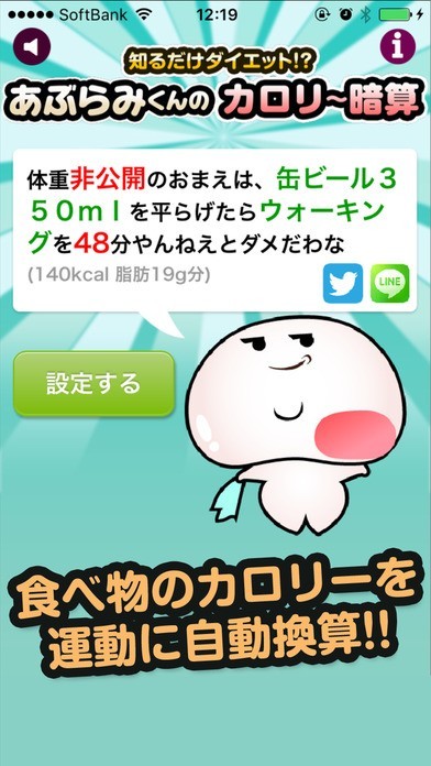 「あぶらみくん」が食べ物のカロリーを運動量に換算して、ダイエット中のみんなを教育してくれます。