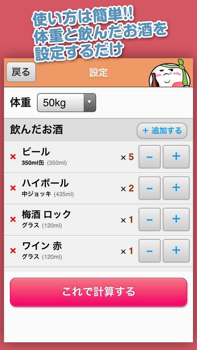 「二日酔いチェッカー」はお酒がぬけるまでの時間を計算できるアプリです。飲んだお酒の種類と杯数、体重を入力。酔いが覚めるまでの正確な時間を分単位で表示できるので、2日酔いの予防や飲酒運転防止に役立ちます。定番のビールから梅酒までさまざまなお酒がありますし、よく飲用するお酒を登録することも可能です。結果はSNSにも投稿できるので、友人ともシェアできます。キャラがハシ置きやコースターになるジョークモードをつかえば、お酒の席を楽しくします。