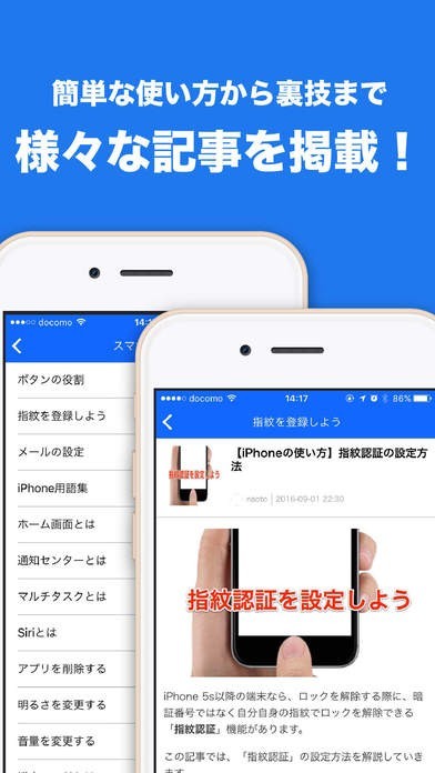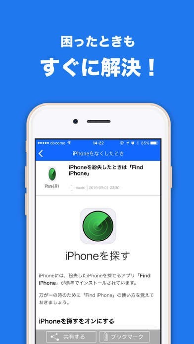 iPhoneの基本的な使い方から裏技まで、iPhone初心者から上級者まで幅広いユーザーの役に立つテクニックが収録されているアプリが「スマホ説明書」です。ボタンの役割やメールの設定など、カテゴリー別に分類されているので調べたい情報をすぐに探し出すことが出来るようになっているほか、困ったときの対処方法やもっと使いこなすための裏技も収録されていて、気になったテクニックを後で読み直すときに便利なブックマーク機能も搭載されています。おすすめのテクニックを友達や家族同士でシェアすることも可能となっているので、便利な裏技を教えあうことが出来ます。