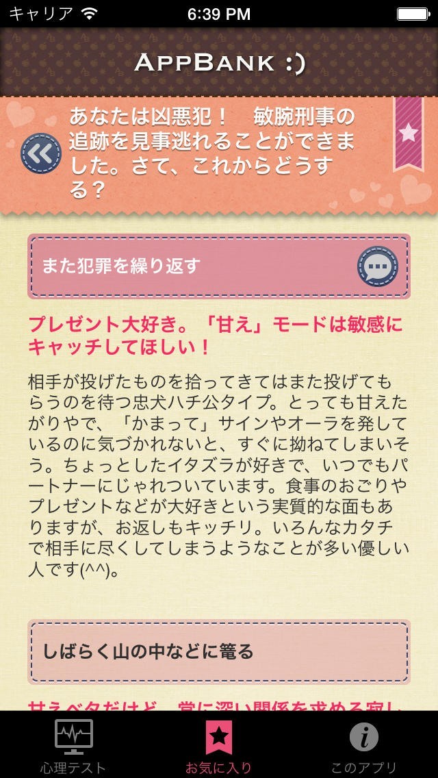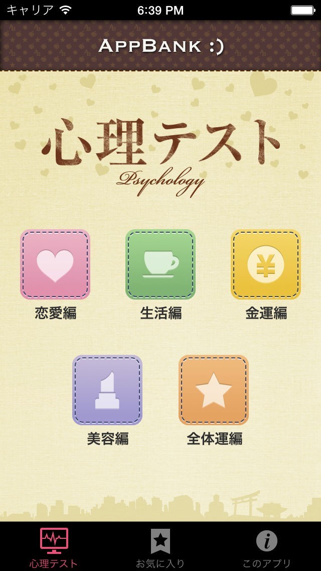 「心理テスト」は、約150個以上の心理テストが受けられる占いアプリになっています。テストはアップデートの度に追加されるので、新しい診断が随時可能です。心理テストは恋愛運・全体運・金運・美容運・生活運など5つのカテゴリに分けられており、気になるものを選んで診断できます。気にいったテストはお気に入り登録も可能です。診断結果も詳しく記載されるので、見ているだけで楽しいでしょう。診断結果はツイッターに投稿することも可能なので、友人と共有しても盛り上がるでしょう。