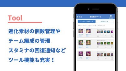 経験値計算ツールを使えば目標ランク到達に必要な経験値が表示されたり、効率のよいダンジョン周回数を表示することができます。スタミナ管理ツールで目標に達したときに通知を受けとることができたり、進化素材計算ツールで進化に必要な素材を調べることもでき、賢く使えるアプリです。