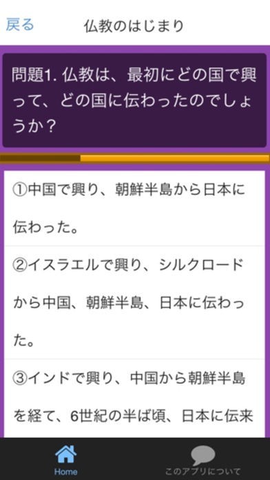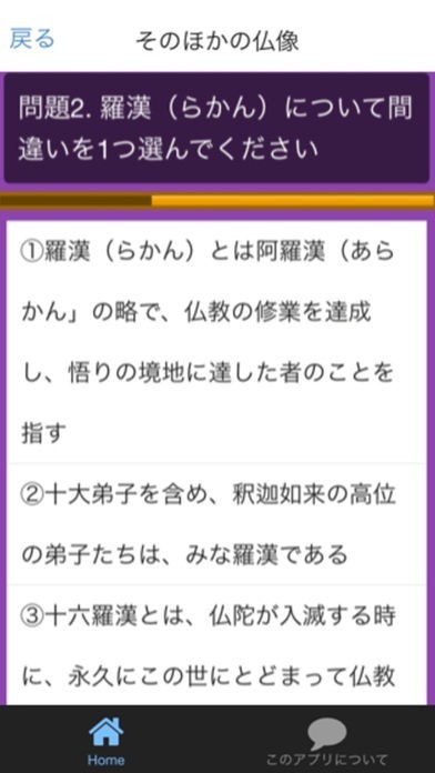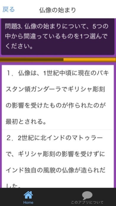 択一や○×式を組み合わせて正しい答えを選びます。仏像の起源から始まり、だんだんと詳細がわかっていくような仕組みになっています。