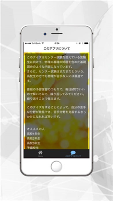 App Storeより引用センター試験を控えている受験生に向けて、物理の基礎の問題を含めた基礎固めのような内容になっています。