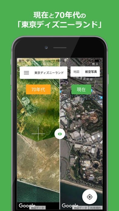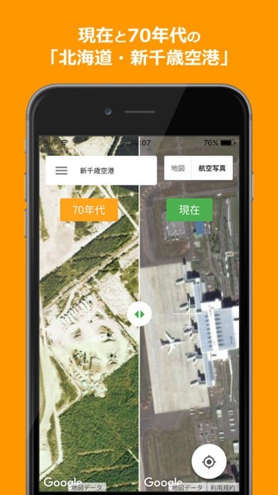 昔の航空写真地図は1970年代の航空写真を閲覧できる画像アプリで、グーグルマップによる現在の画像と1970年代の比較をして楽しむことができます。また、一部の地域では1936年、1945年、1976年、1981年、1985年、1990年に年代を変更して航空写真を表示できます。また現在位置の取得が可能で現在地の比較が手軽に楽しめます。