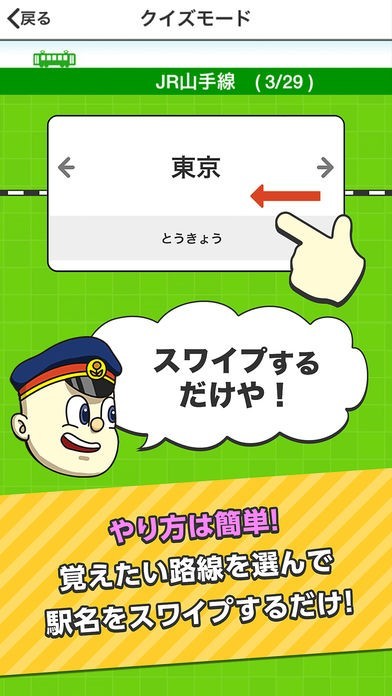 「JR山手線」、「JR東海道本線」など路線名をタップすれば、その路線の駅だけを覚えるとが可能です。乗り換え路線も網羅しているので、これさえあればあなたは鉄道マニアの仲間入りです。