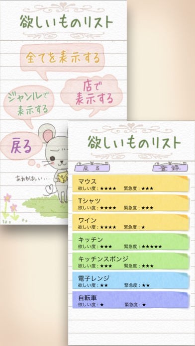 欲しいものリスト機能は、ライフスタイルに合わせてジャンルに分け、店表示ができます。備忘録として欲しい度と緊急度から、買い忘れを防ぎ効率よく買い物ができるようになります。