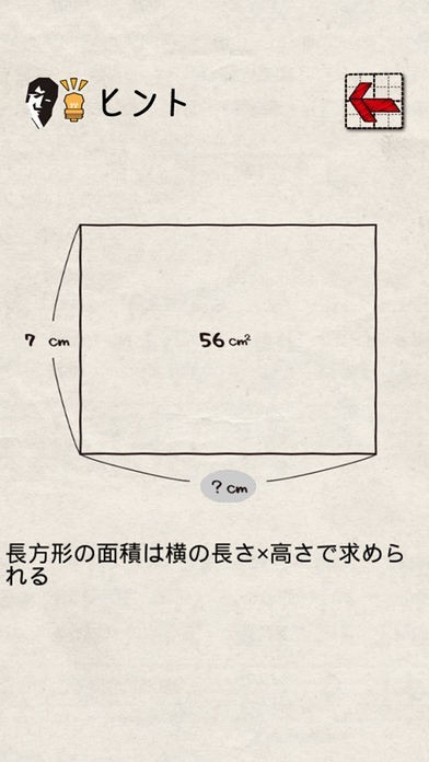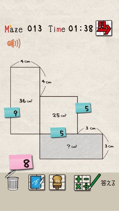 わかっている長さや面積から「?」の長さや面積にたどり着くまでを考える計算の迷路です。
