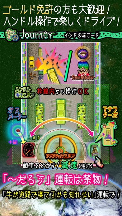 カオスMAX状態なインドの道を走り、乗客を何人乗せられるかにチャレンジする1ミス終了のエンドレスゲーム。敵車との接触はもちろん、ガソリン切れも要注意!