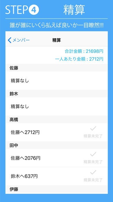 このようにメンバーが色々な支払いの立替をしていると、最後の精算のときに、誰が誰にいくら支払えば良いのか計算するのが大変...