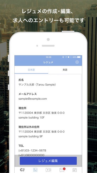 日本語、英語に対応したレジュメの作成・更新が可能です。