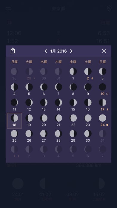 1年間の月相がカレンダーに表示されます。月ごとのカレンダーの日付下に月相が表示されます。月相は月ごとに一覧表示されるので、月の満ち欠けが分かりやすくなっています。
