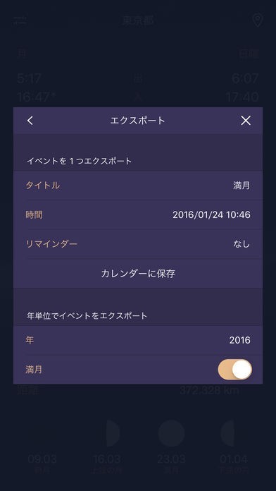 リマインダーで日時を登録すれば、見たい月を逃すことがありません。さらに、満月や新月など、月齢ごとに設定することも可能。年単位での設定もできるため、登録した月の状態ごとに毎回知らせてもらえます。