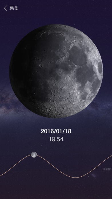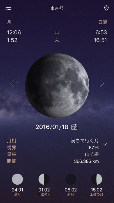 満月や上限の月など、移り変わる月を画像で見ることが可能です。月がいまどこにあるのか、月相などの必要な情報をトータルでチェックできますし、何時に月が見え始めるのかもわかります。