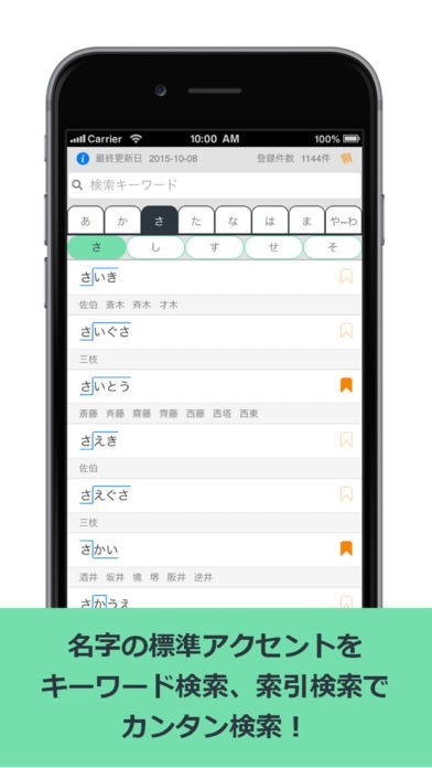 自分がアクセントを間違えやすいなど特に注意したい名字はしおりを付けることで登録しておくことができます。いつでもまとめてチェックできるので、必要な時にすぐにアクセントを確認できます。