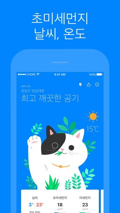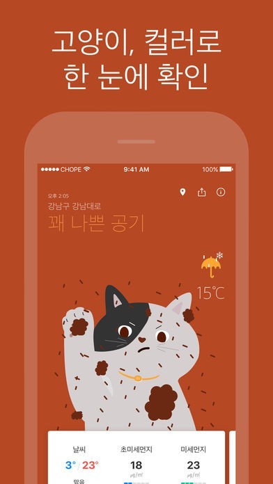귀엽고 센스 넘치는 그래픽으로 미세냥이 지금 이순간의 미세먼지 상태를 알려줄게요!