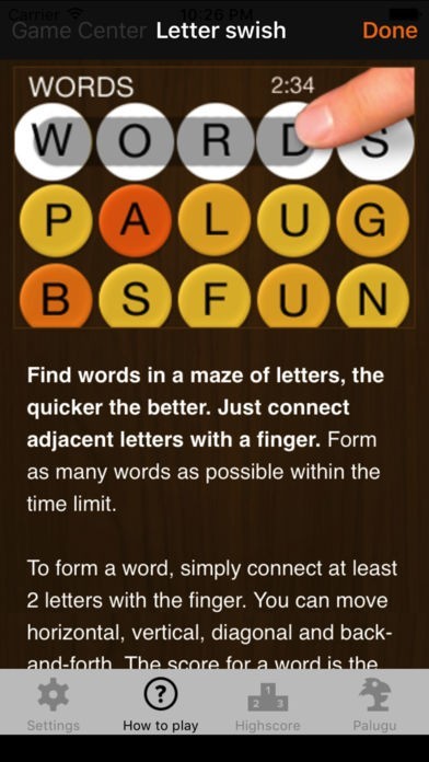 To form a word, simply connect the letters with the finger. You can move horizontal, vertical, diagonal and even back-and-forth. The score for a word is the sum of the letter values. The color of the stone shows the points: the darker the color, the more points you get for this letter.