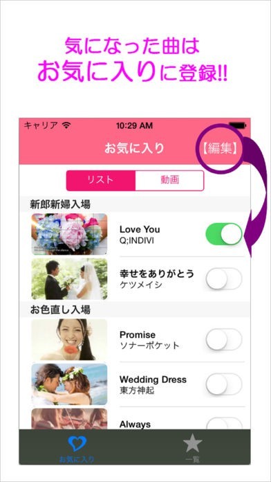 新郎新婦入場、プロフィールムービー、乾杯、ケーキ入刀等、シーン別に自分にピッタリの曲を見つけられます。気に入った曲をマイリストに追加する事で自分だけの結婚式曲リストを作る事ができます。