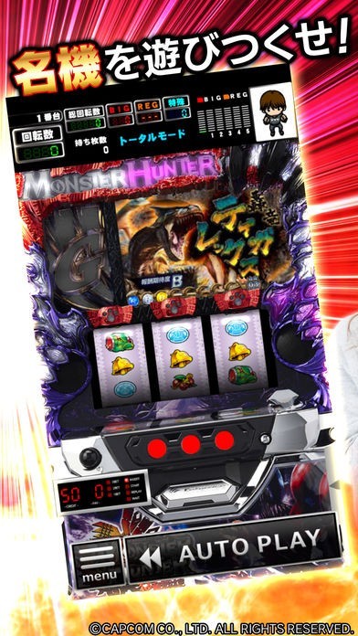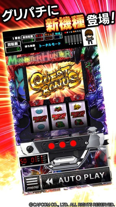 「[グリパチ]パチスロ モンスターハンター 狂竜戦線」とは、カプコンが発売した大人気のハンティングアクションゲーム、モンスターハンターとのコラボレーション作品です。通称モンハンと呼ばれて「ひと狩り行こうぜ」が流行るほど10代中心にブームになりましたね。そのモンスターハンターの世界観をそのままスマートフォンアプリに移植したタイアップ機『パチスロ モンスターハンター 狂竜戦線』がグリパチにも登場しました。 リアルのマジスロ実機と変わらない設定仕様なので、パチスロアプリの中でもクオリティは群を抜いています。オフラインモードで練習も可能で、データカウンターもついているのでデータ取りしたい方は自由にできます。