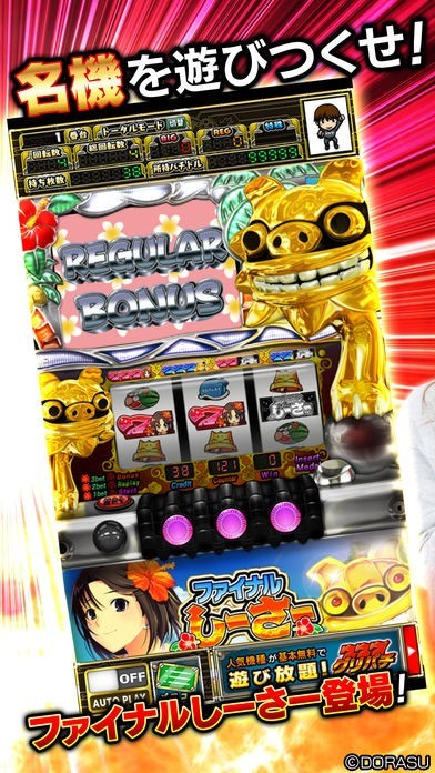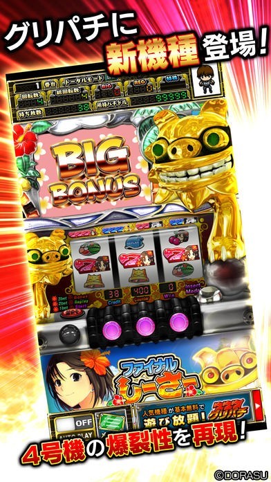 「グリパチ ファイナルしーさー」は、多くのパチスロシミュレーターを送り出してきた「株式会社ドラス」による、ハイクオリティーなパチスロアプリです。ファンにはおなじみの名機「ファイナルしーさー」をベースに、内部抽選や演出、BGMなどはすべてアプリ用のオリジナルとして作られています。初心者もプレイしやすい親切な設定と、キュートなキャラクター「ヒカリちゃん」、そして“4号機の爆裂性”を再現した独自の演出が話題です。なお、このアプリをプレイするときは、オンラインホールアプリ「グリパチ」のダウンロードと、GREE(グリー)の無料会員登録・ログインが必要になります。