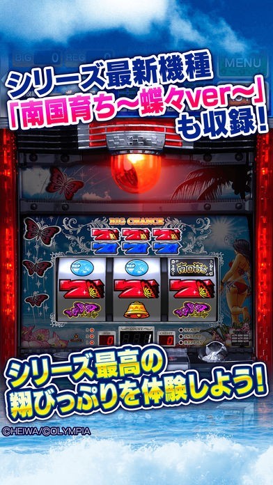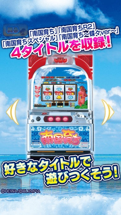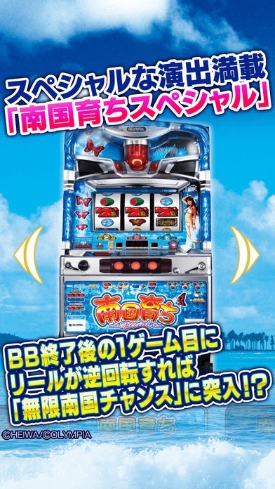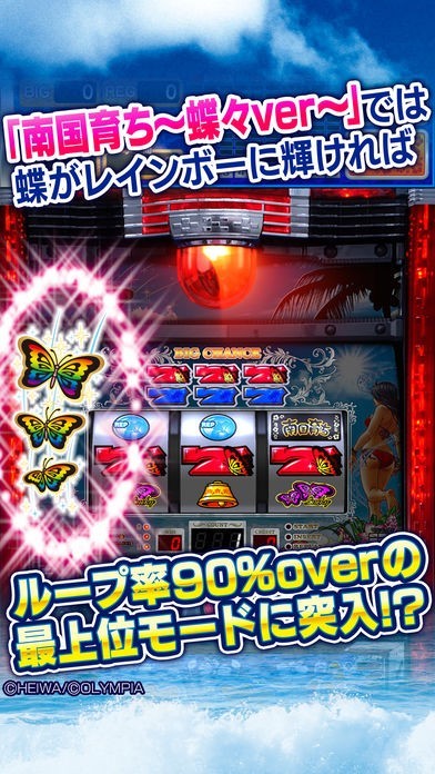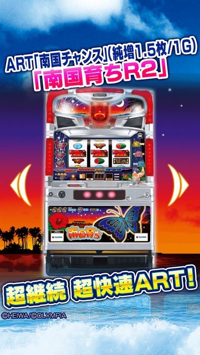 このパチスロアプリならば、南国シリーズ、南国育ち、南国育ち R2、南国育ちスペシャルに最新の南国育ち~蝶々ver~の4タイトルが楽しめる。すべての機種に体験機モードが搭載。小役強制などおなじみのゲーム性が実際にパチスロを打っている気分を充分味わえる。