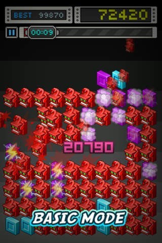制限時間3分という時間内にスコアを目指すベーシックモードは、ひたすらスコアを稼いで技を磨くのに最適です。基本ルールは2つ以上の同じ色のブロックを揃えて消すことですが、たくさん繋げてから消すと大爆発を起こし高得点もゲットできます。