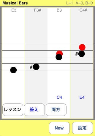 「レッスン」(課題)と、「答え」は何度でも聞くことができますので、一音づつ確認しながら答えていくことができます。また、「両方」を同時に再生できますので、合ってない音を確認することもできます。コードレッスン時の「両方」は連続再生となります。