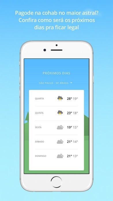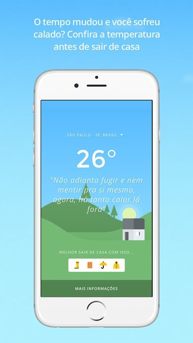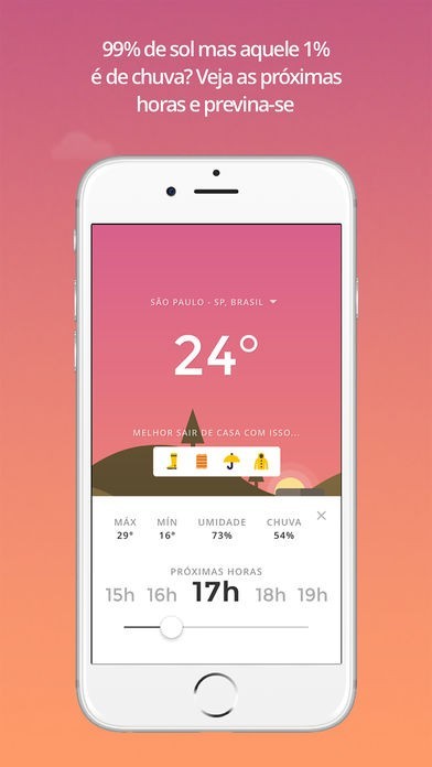 Tropical é um aplicativo de previsão do tempo que além de te dar as informações básicas como temperatura também te dá dicas do que usar ou levar no seu dia de forma divertida. Também é possível ver a previsão das próximas horas ou dias, assim você não precisa esperar sair de casa e ouvir sua mãe dizer: filho, leve o guarda-chuva!